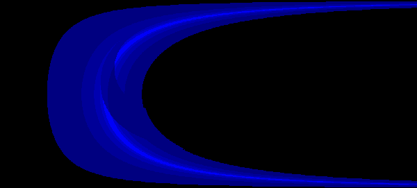 The next step is to try all the possible values. The picture below shows the results of shooting a projectile from 0 to 90 degrees (from bottom to top) and from 1 to 1000 meters per second (from left to right). It is trying to hit a target 2000 meters away, and the different colors show how far away it landed (they get dimmer exponentially).
