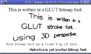 Font Demo This program shows how to use stroke fonts which can be scaled and transformed in 3D whereas the other bit mapped fonts cannot. Source Code Modified Code |