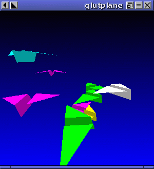 Paper Airplanes This program draws a number of "Paper Airplanes" using the GL_TRIANGLE_STRIP option. The planes fly around randomly in the window. The program has several useful features including how to attach a Pull Down Menu, how to create a shaded background, and how to add additional objects to the display. Source Code |