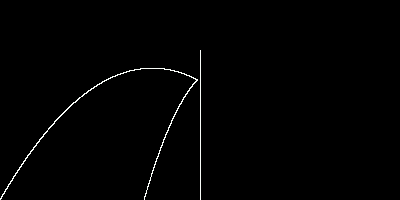 Then, you want to change something with the simualtion, such as adding wind or a gravitational attractor. We decided to add walls. When a projectile hits a wall, it rebounds with its velocity halved. First we modified our original projectile firing program to test our ideas. Here is the same trial as the first with a wall added.