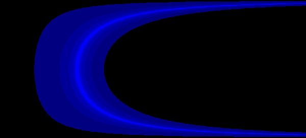 The next step is to try all the possible values. The picture below shows the results of shooting a projectile from 0 to 90 degrees (from bottom to top) and from 1 to 1000 meters per second (from left to right). It is trying to hit a target 2000 meters away, and the different colors show how far away it landed (they get dimmer exponentially).