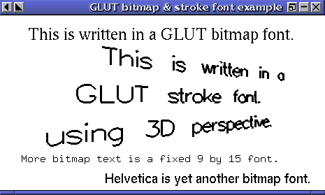 Font Demo This program shows how to use stroke fonts which can be scaled and transformed in 3D whereas the other bit mapped fonts cannot. Source Code Modified Code |